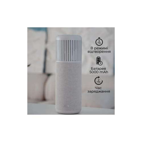 - Li-Pol батарея 5000 мА⋅год: До 3 годин у режимі музики, або 2 години у режимі музики та світла. Повністю заряджається за 2 години комплектним адаптером.