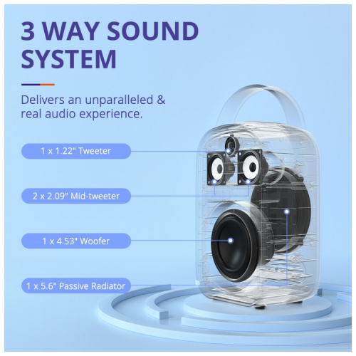 Колонка оснащена трисмуговою акустичною системою, що забезпечує чистий і збалансований звук без спотворень. Це означає широку звукову сцену з насиченими басами, чіткими середніми частотами та яскравими високими нотами. Завдяки потужності 60 Вт, колонка може заповнити звуком навіть велике приміщення.