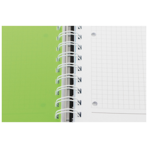 Блокнот формату A4 (200x285). Кріплення блока — спіраль. Обкладинка — пластик. Внутрішній блок — клітинка, цупкість паперу — 70 г/м², кількість аркушів — 120. З роздільниками блока. Вироблено в Україні.