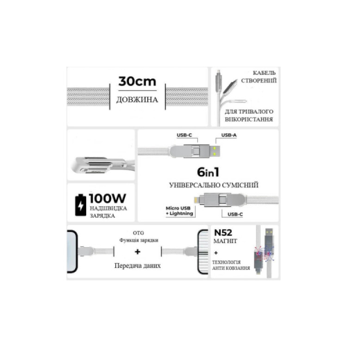 - 6 в 1 – поддерживает все популярные типы соединений: USB-A → USB-C; USB-A → Lightning; USB-A → Micro USB; USB-C → USB-C; USB-C → Lightning; USB-C → Micro USB