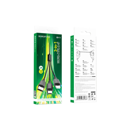 Кабель Borofone BX72 3 in 1 USB Micro / Lightning / Type-C 2 A 1 м Black є кабелем, який дозволяє заряджати до трьох різних пристроїв одночасно ─ смартфони, планшети та інші мобільні пристрої. Кабель оснащений трьома конекторами ─ Lightning, USB-C та Micro USB. Нейлонова обплетення високої щільності служить надійним захистом від перегинів та пошкоджень кабелю.