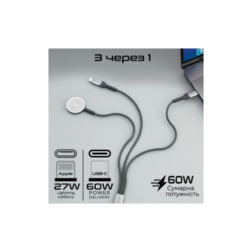 Опис Дата кабель USB-C to Lightning 27W + USB-C 60W + Apple Watch 2.5W 1.5m icharge trio black Promate (icharge-trio.black)