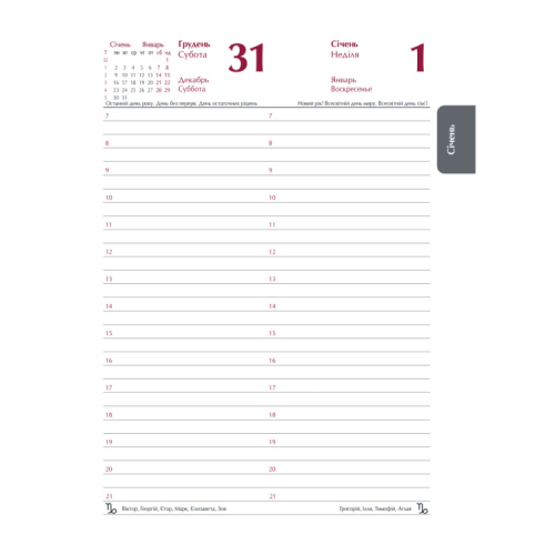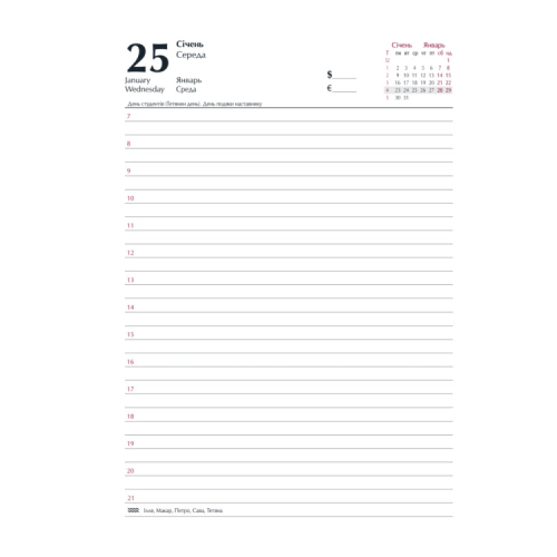 - Датированная страница на каждый день года с организатором времени от 7:00 до 21:00, календарем на текущий/следующий месяц, обозначением дня недели, знака зодиака, именинников