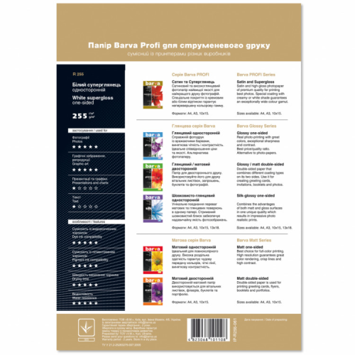 Папір BARVA A4 PROFI (IP-BAR-P-R255-061) cумісний з водорозчинним і пігментним чорнилом. Водостійкий. Ідеально підходить для друку фотографій і графічних зображень.