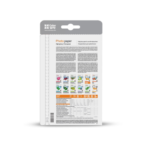 Глянцевий папір ColorWay® для струменевого друку. Має гладку, глянцеву вологозахищену поверхню. Миттєво вбирає водорозчинні чорнила. При друку пігментним чорнилом рекомендовано просушувати відбиток щоб запобігти змазуванню з поверхні. Ідеально передає яскраві, насичені кольори з безліччю відтінків. Зберігати в сухому місці в стороні від сонячного світла. Температура зберігання від 5°С до 25°С. Термін придатності 5 років від дати виробництва. Дата виробництва вказана на упаковці. Не містить шкідливих для здоров'я речовин. Надруковані знімки рекомендовано зберігати в альбомах або в рамках під склом. Ця модель паперу призначена тільки для друку на струменевому принтері та персонального використання.
