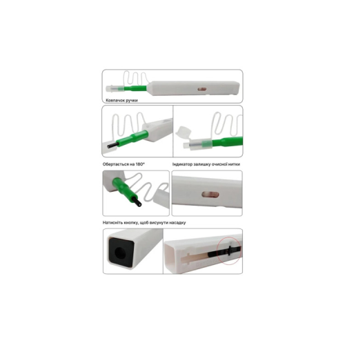 Очищення конектора відбувається за рахунок безворсової очищувальної нитки на кінчику інструменту. При введенні інструменту в конектор і натисканні, очищувальний кінчик з ниткою провертається, забезпечуючи акуратне і ефективне очищення.