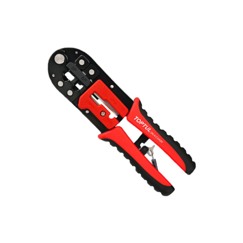 Клещи для обжимки (RJ11/RJ12/RJ45) и снятия изоляции трещоточные Toptul DKAC2420 — профессиональный модульный обжимной инструмент с функциями отрезания и зачистки кабеля. Подходит для обжима 6-позиционных разъемов RJ-11/RJ-12 и 8-контактных разъемов RJ-45.