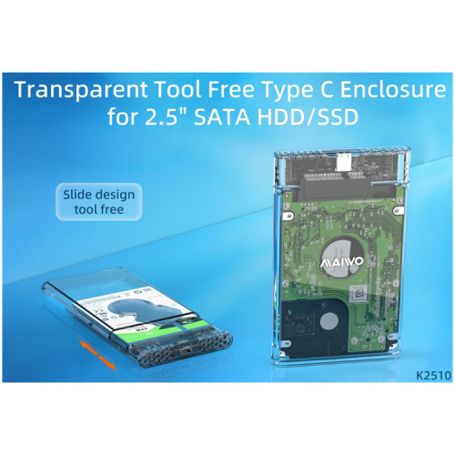 Прозрачный внешний карман Maiwo K2510 для 2.5-дюймовых дисков SATAI/II/III HDD или SSD, с кабелем подключения USB 3.1 Gen1 Type-C - идеальное решение для расширения возможностей хранения данных вашего компьютера или ноутбука. Этот корпус легко превращает 2.5-дюймовый HDD SATA или SSD в портативный внешний накопитель с высокой скоростью передачи данных до 5 Гбит/с через USB 3.1.