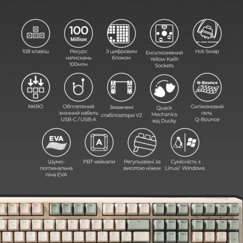 - Кейкапи: Виготовлені з міцного PBT пластику з лазерним гравіюванням українських літер, що гарантує довговічність і стійкість до стирання.
