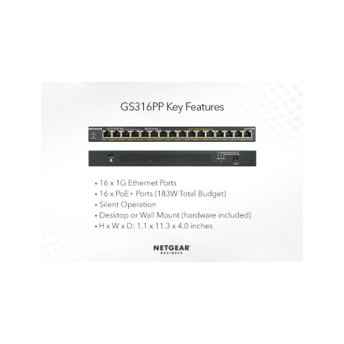 Неуправляемый гигабитный коммутатор NETGEAR GS316PP с 16 портами PoE+ Gigabit Ethernet с общим бюджетом мощности 183 Вт и фирменной технологией автоматического баланса мощности NETGEAR FlexPoE.