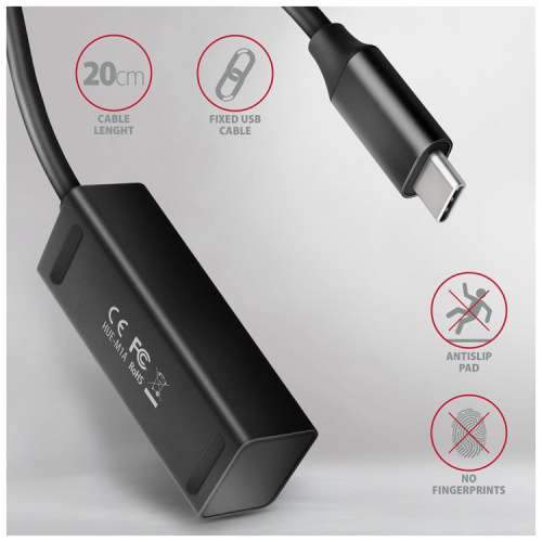 AXAGON HUE-M1C — це мініатюрний, надійний і надзвичайно зручний USB-C хаб стандарту USB 3.2 Gen 1, який забезпечує швидке підключення до чотирьох пристроїв одночасно. Його компактність і міцна алюмінієва конструкція роблять модель ідеальною для щоденного використання вдома, в офісі чи в дорозі. Поверхня з дрібною текстурою стійка до подряпин і слідів пальців, а гумові вставки на нижній частині запобігають ковзанню на гладких поверхнях.