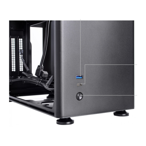 Особливість конструкції корпусу — панелі з алюмінієвого сплаву, виготовлені з магнієво-алюмінієвого 2 мм листа. Таке суворе, певною мірою — мінімалістичне виготовлення, чудово підійде для користувачів, які поважають витриманий стиль і елегантність. Тут же в нижній третині панелі виробник виніс високошвидкісний порт USB 3.0, порт Type-C, велику кнопку ввімкнення живлення. На верхній грані розмістився протипиловий фільтр, що перешкоджає потраплянню дрібнодисперсних частинок усередину комп'ютера.