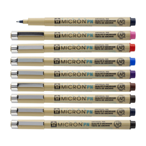 Серия Sakura Pigma Micron PN - новинка 2018 года от Sakura (Япония) - для тех, кто долго и часто пишут или рисуют ручками. .д.Sakura Pigma Micron PN имеет наконечник из полиацеталя (вид пластика), а чернила такие же, как в классических линерах Pigma Micron. Основные характеристики: - толщина линии может варьировать от 0,4мм до 0,5мм и зависит от силы нажатия на ручку - наконечник (из полиацеталя) обеспечивает равномерную подачу чернил для непрерывных линий любой длины, не зависимо от положения ручки и темпа работы - Высокий уровень светостойкости - чернила архивного качества - водо- и химическистойкие- Отлично сочетаются с акварелью, чернилами, гуашью и т.д. красный, бордовый, пурпурный, сепия, розово-красный, синий, черно-синий. Производитель: Sakura, Япония