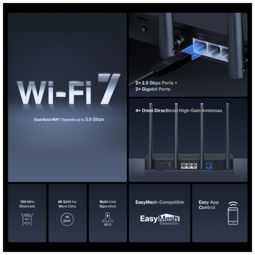 Оснащений чотирма незнімними антенами та портами зі швидкістю до 2.5 Гбіт/с, MR27BE відмінно підходить для підключення ПК, смарт-телевізорів та ігрових консолей, забезпечуючи стабільне та швидке дротове з'єднання. Використовуйте протоколи l2TP, IPv4, IPv6, PPPoE і PPTP для налаштування мережі на ваш смак.