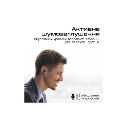 - Активне шумозаглушення (ANC): Вбудовані 6 мікрофонів вловлюють сторонні шуми в режимі реального часу та компенсують їх за допомогою технології на основі штучного інтелекту.