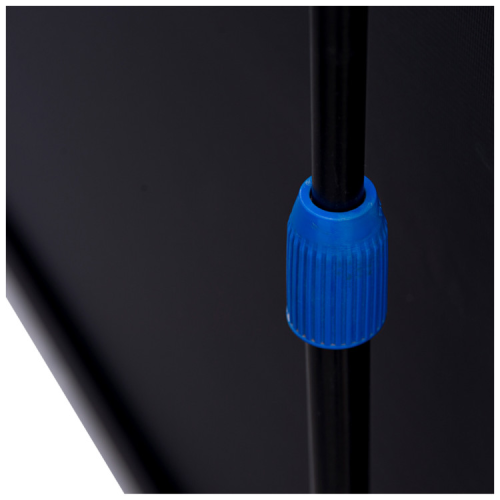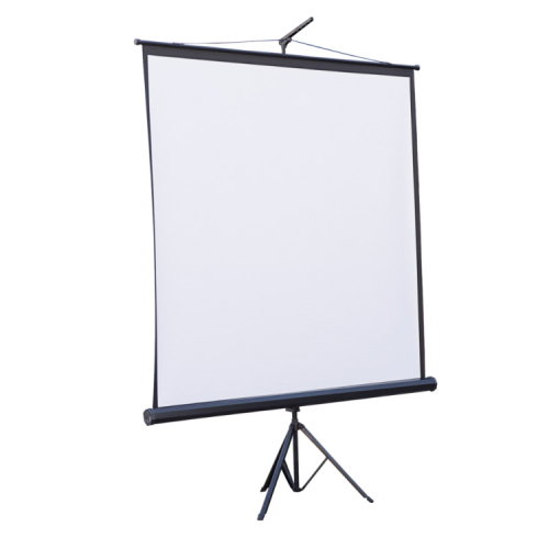 Мобільний екран ATRIA TRM-NTSC-120D з триногою у міцному корпусі, придатний для щоденного використання. Механізм автоматичного блокування управляє регулюванням висоти. Чорна оборотна сторона матеріалу запобігає проникненню світла.