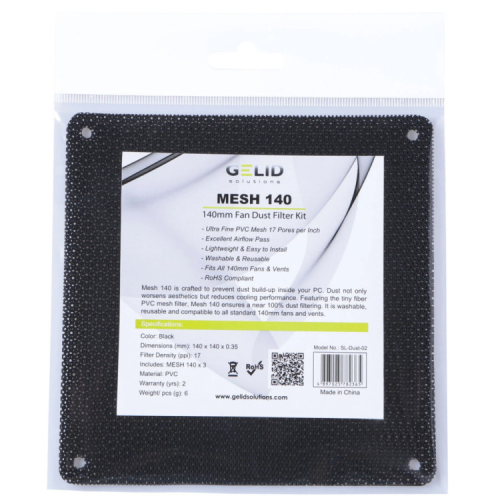 Пиловий фільтр Gelid Mesh 140 захищає від пилу ваш комп'ютер. Пил усередині комп'ютера істотно погіршує ефективність охолодження та стає джерелом додаткового шуму. Скупчення пилу також акумулюють статичну електрику, що може спричинити збої в роботі комп'ютера та скорочує термін експлуатації.