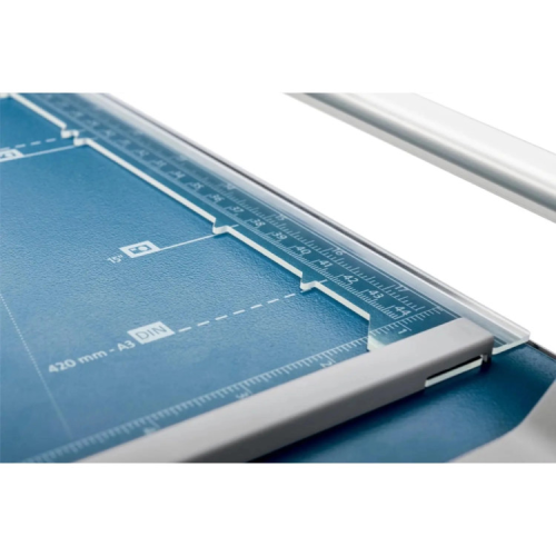 Резак Dahle 508 нового поколения «Generation 3» для выполнения небольших объемов работ по порезке бумаги. Длина реза - 460 мм. Толщина стопы - 0,6 мм. На столе нанесена разметка стандартных форматов бумаги с мм-шкалой, включая фото размер, а также метки для реза под углом. Две направляющие упора для точности при порезке и удобства резки. Дисковый нож этого резака при резке плотно прижимается к контрлезвию, обеспечивает процесс самозатачивания. Возможность реза в обоих направлениях вдоль направляющей. Прозрачная пластиковая направляющая плотно прижимает бумагу во время движения ножа, обеспечивает автоприжим, точное позиционирование и возможность наблюдать линию реза в момент разрезания материалов. Прозрачная пластиковая направляющая со вспомогательной маркировкой форматов - «зубцы». Металлическое основание. Возможность замены ножа. Опционально можно укомплектовать сменными ножами: биговка, микроперфорация, фигурный рез. ТМ Dahle - премиум-класс, режущее оборудование, техника для офиса и офисные аксессуары. Сделано в Германии!