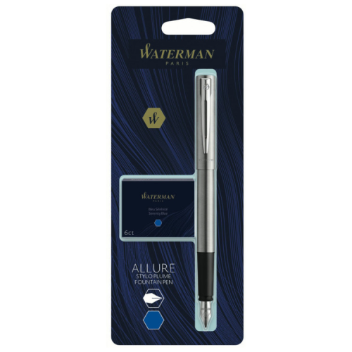 Сталева перова ручка з тонким сталевим пером Waterman ALLURE Chrome CT з набором картриджів Waterman Mini. Цікава пропозиція для всіх, хто цінує стриманий французький шик, а поєднання кольорів робить ручку привабливою для жінок та чоловіків.