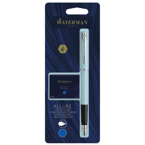 Матово-блакитна перова ручка з тонким сталевим пером Waterman ALLURE Pastel Blue CT з набором картриджів Waterman Mini. Цікава пропозиція для всіх, хто цінує стриманий французький шик, а поєднання кольорів робить ручку привабливою для жінок.