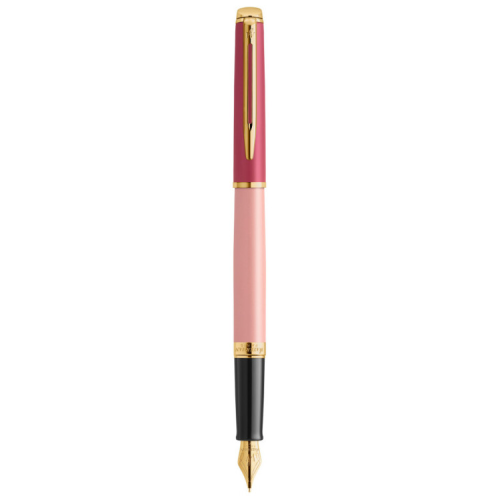 Жіноча перова ручка Waterman HEMISPHERE Color Blocking Pink GT FP F з тонким пером із позолоченої сталі. Оформлена у двох взаємодоповнюючих один одного відтінках рожевого кольору. Її вражаючу привабливість підкреслює класичний силует Hemisphere з косим торцем ковпачка, фірмовий подвійний затискач і приголомшливе оздоблення із золотим напиленням. Перо з неіржавної сталі з гравіюванням та золотим напиленням красномовно демонструє культову модель Waterman із петлею «W».