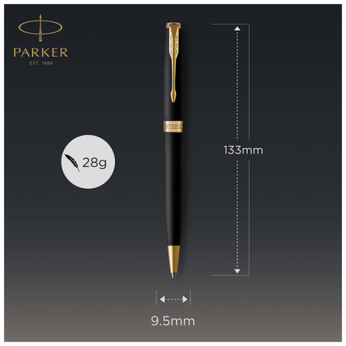 Ручка є частиною патріотичної лінійки Sonnet Ukraine з українською символікою. Приємно відчувається у руці вага повністю металевого корпуса. Матовий лак слугує ідеальним тлом для блискучого золотого оздоблення. Завершальний штрих - це оригінальне гравіювання з назвою та логотипом бренду на середньому кільці ковпачка, а також фірмовий затискач у вигляді стріли. Кулькові ручки Parker можна заправляти кульковими (Quink Flow) та гелевими (GEL) стрижнями. Ручка пише м'яко, а чорнило не розмазується.