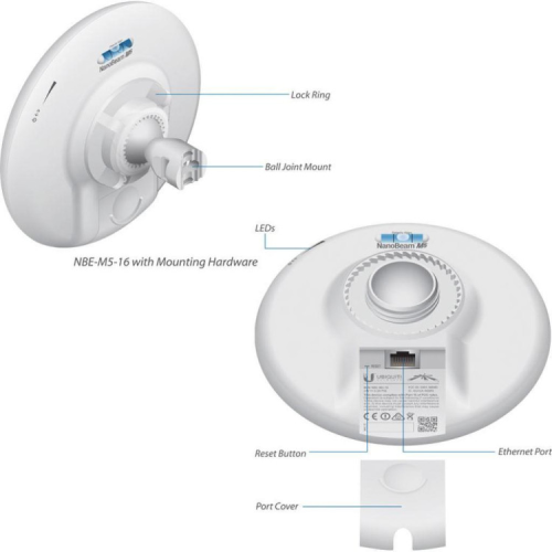 Точка доступа Wi-Fi Ubiquiti NBE-M5-16– точка доступа 5ГГц из новой серии оборудования Nanobeam™M. Конструктивной особенностью является объединение антенны и радиомодуля в одном цельном корпусе, что позволяет достичь усиления 16 дби с минимальной опорной поверхности. Диаметр устройства – всего 14 см. Узконаправленная передача сигнала позволяет отфильтровать шумы, а протокол TDMA - получить высокую пропускную способность.