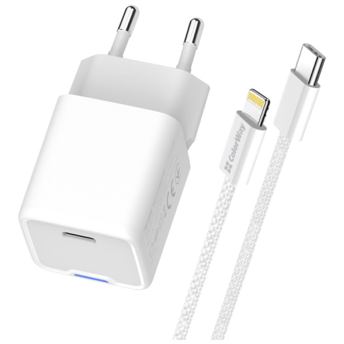 Опис Зарядний пристрій ColorWay C101D GaN Mini 20W PD PPS USB-C + cable USB-C to Lightning white (CW-CHS059PDL-WT)