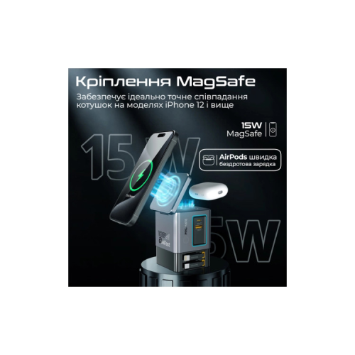 Promate PowerSync-105 - заряджай до 6 пристроїв одночасно з потужністю до 105W. GaN-технологія, магнітна зарядка MagSafe 15W, бездротова зарядка для AirPods, кабелі USB-C PD 65W і Lightning 20W – усе в одному стильному рішенні.